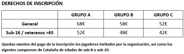 1. De 5€, los participantes en el Open Sunway 2025 (asimismo, quien participe en este Open tendrá también bonificación en la inscripción al Open Sunway 2026)2. De 5€, los jugadores con discapacidad reconocida por la FCd’E
